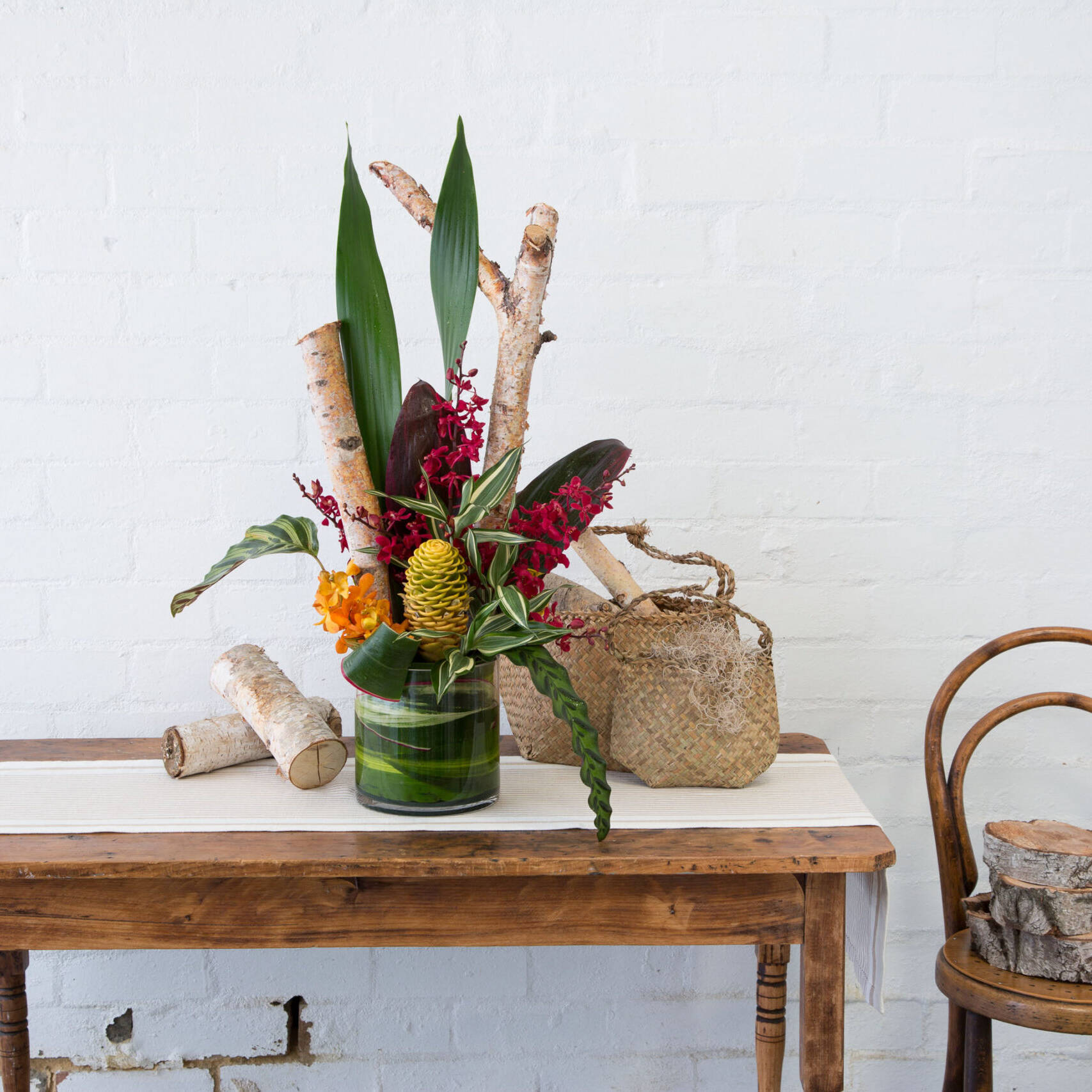 Often seen in corporate office or home settings, this spectacular arrangement teaches you how to work with standout tropicals and create a linear design, emphasising negative space and natural lines.